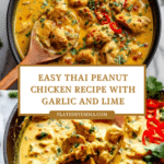 This Thai Peanut Chicken recipe features tender chicken thighs marinated in a rich, creamy peanut sauce infused with coconut milk, lime, garlic, and spices. The chicken is broiled or grilled to perfection, then served with rice and garnished with fresh herbs and crunchy peanuts for a vibrant, flavorful dish inspired by Thai cuisine.