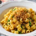 A close-up view of a white bowl with a raised decorative edge filled with small ring-shaped pasta mixed with green peas, coated in a creamy yellow sauce, and topped with a generous layer of golden toasted breadcrumbs. The pasta sits in a slightly heaped mound in the center, showing the soft, glossy texture of the sauce on the noodles and the crunchy breadcrumb topping. The bowl is placed on a white marbled surface, and the background includes soft pastel colors slightly blurred. photo taken with an iphone --ar 4:5 --v 7