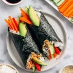 Tofu Temaki Sushi, also known as hand rolls, offer a fresh and fun way to enjoy sushi at home. Filled with crisp vegetables and savory baked tofu, these easy-to-make rolls come with a flavorful ginger-tamari sauce that brings everything together perfectly.