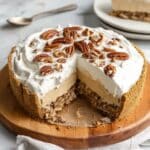 This Vanilla Bean Brown Butter Cheesecake offers a rich and nutty twist on the classic dessert. Featuring a buttery graham and pecan crust infused with browned butter, this cheesecake filling is smooth and creamy with the warm flavor of vanilla bean and brown butter. It’s baked in a water bath for a silky texture, topped with lightly whipped vanilla cream, making it a decadent and elegant dessert perfect for special occasions.