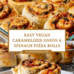 Keywords: Vegan pizza rolls, caramelized onion pizza rolls, spinach pizza rolls, vegan appetizer, homemade pizza rolls, plant-based snacks
