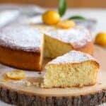 The image shows a single-layer round cake with a light golden brown crust and a soft, moist, pale yellow inside. The cake is dusted with a thin layer of white powdered sugar on top. A slice is cut from the cake and placed in front, resting on a white wooden surface with a rustic bark-edged wooden board underneath. The background includes a couple of small yellow fruits and some orange peel garnishes on the whole cake. The texture of the cake looks tender and slightly crumbly. photo taken with an iphone --ar 4:5 --v 7