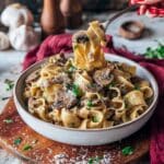 A creamy and delicious Vegan Stroganoff featuring a rich cashew cream sauce blended with garlic and sautéed mushrooms, served over tender tagliatelle noodles. This plant-based twist on a classic comfort food is perfect for a satisfying, dairy-free meal.