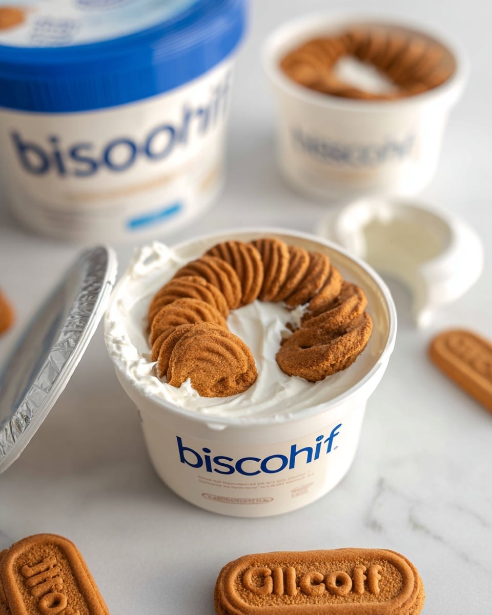 - Insert cookies: Press 6 Biscoff cookies straight down into the yogurt in a row, pushing them in until just the tips are visible. The goal is to cover most of the surface; precise placement is not necessary.