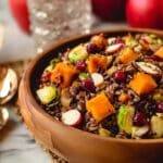 These Wild Rice Harvest Bowls are a hearty and wholesome meal featuring a blend of wild rice, roasted butternut squash, and golden Brussels sprouts, all tossed with crisp apples, white cheddar, almonds, and dried cranberries. Finished with a sweet and tangy Fig Balsamic Vinaigrette, this dish showcases a beautiful medley of autumn flavors perfect for a nourishing lunch or dinner.