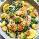 This Zesty Lemon Gnocchi with Garlic Chicken is a delightful and creamy dish combining tender potato gnocchi with succulent sautéed chicken breasts. Infused with fresh lemon zest and juice, garlic, and a hint of red pepper flakes, this recipe delivers a perfect balance of bright, savory, and mildly spicy flavors. Finished with baby spinach and Parmesan cheese, it’s an elegant yet simple meal ideal for a quick weeknight dinner or entertaining guests.